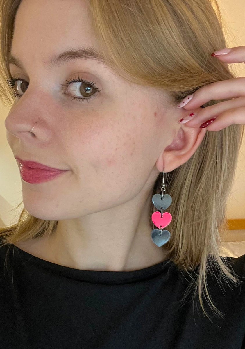 Kolme sydäntä samassa korvakorussa kertovat elämän monikerroksisuudesta. Ensimmäinen sydän kantaa mukanaan surua ja ikävää. Toinen sydän kuvaa rohkeutta jatkaa eteenpäin. Kolmas sydän on pysyvä muisto, joka säilyy sydämessä. Tummemmat sävyt viittaavat menetyksen kosketukseen, keskellä punainen sydän muistuttaa toivosta ja rakkaudesta, joka ei katoa.