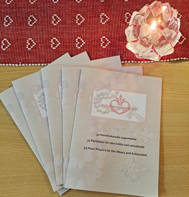 Korupaja Marian sydän’s Prayer Booklets are designed to accompany handheld prayer beads but can just as well be used on their own. Each booklet contains prayers for various life situations — for the weary, the sick, the grieving, the terminally ill, and those struggling with addiction. The texts are written in Finnish, Swedish, and English, making the booklet meaningful and accessible for many readers.