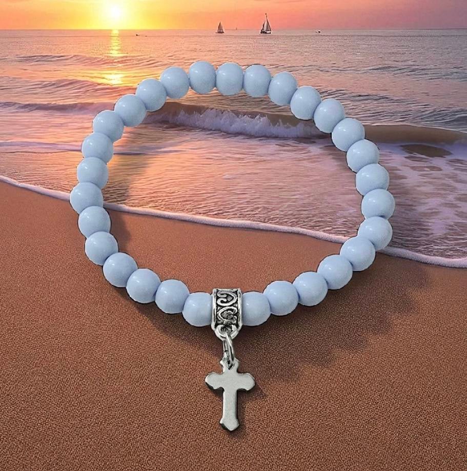 Tämä kaunis ja merkityksellinen rannekoru yhdistää hengellisen symboliikan ja ajattoman muotoilun. Roikkuva risti tai krusifiksi luo koruun selkeän uskon viestin, ja laadukkaat kivi-, puu- tai lasihelmet viimeistelevät kokonaisuuden.