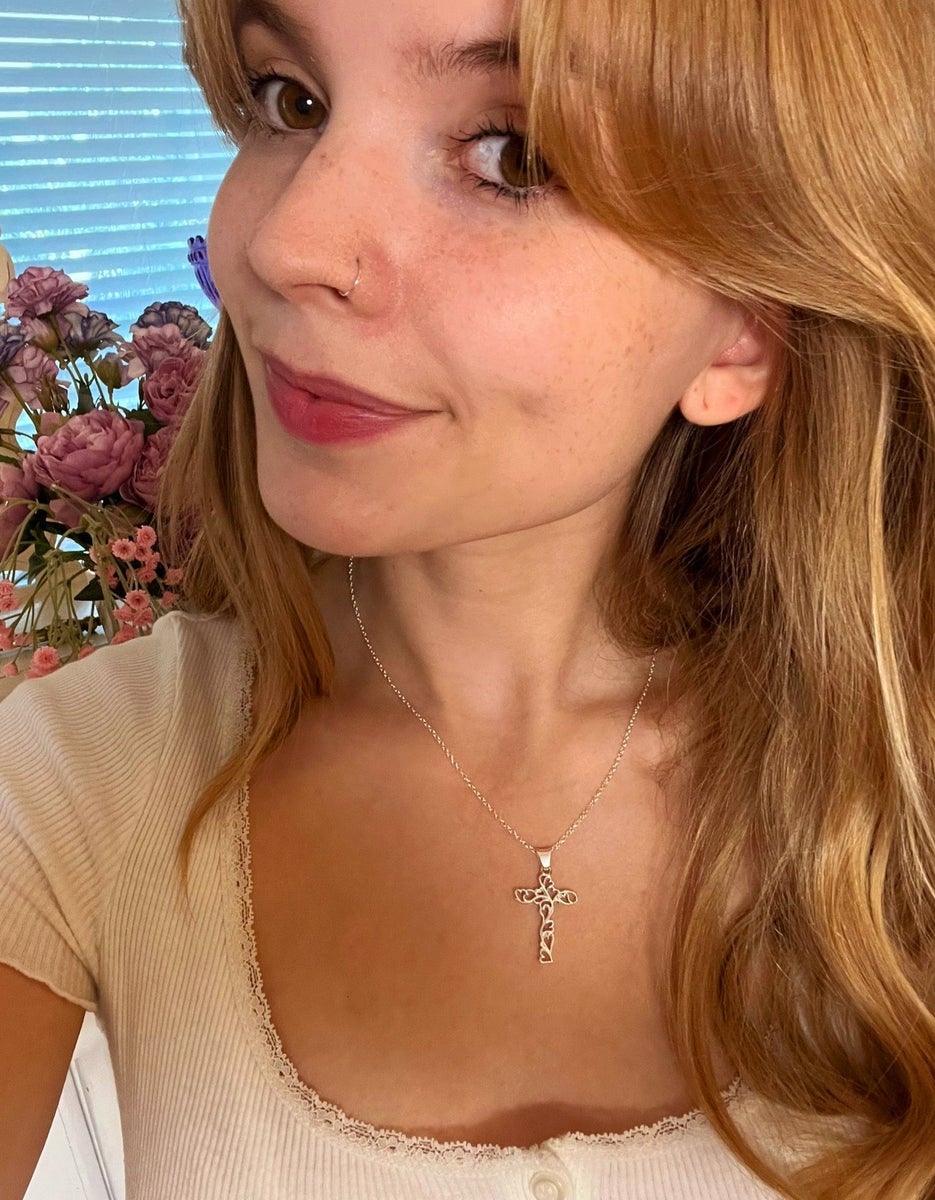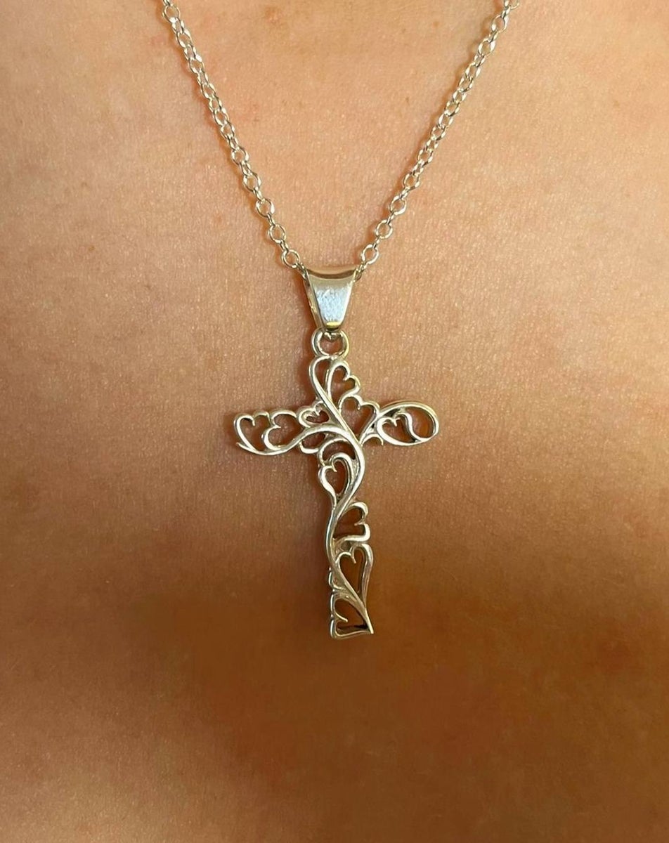 Ristin muotoon punoutuva sydänköynnös kuvaa rakkautta, joka kasvaa ja kantaa. Jokainen sydän muodostaa osan kokonaisuutta, aivan kuten usko ja rakkaus kulkevat yhdessä. Tämä koru sopii niin arkeen kuin juhlaan – muistoksi, lahjaksi tai oman uskon julistukseksi.