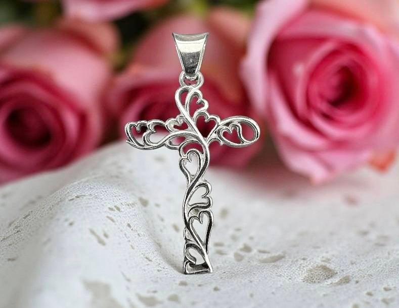 Tämä kaunis hopeinen sydänköynnös-risti on suomalaisen kultasepän käsityönä valmistama koru, joka yhdistää uskon, rakkauden ja toivon yhdeksi kokonaisuudeksi. Se on herkkä mutta puhuttelevan vahva symboli – lahja, joka kantaa merkitystä läpi elämän.