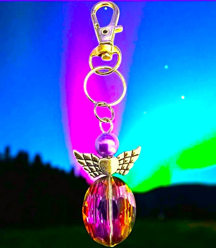 Revontulien Aurora Boreale -värinen fasettihiottu lasihelmi loistaa violetin, kullan ja kirkkaan sävyissä muistuttaen taivaan ihmeellisistä revontulista. Enkelihahmo hopeansävyisin siivin on perinteinen merkki rohkaisusta ja valosta, joka kulkee aina mukana.
