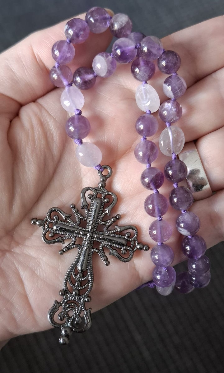 PURPPURAPOLKU Rukousnauha on käsin solmittu helmi helmeltä 8mm ametisti kivihelmistä sekä 10mm lila kivihelmistä. Rukoushelmien päässä on 5cm filigraaniristi, josta rukouspolku alkaa. Purppura mainitaan Raamatussa arvokkuuden ja kuninkuuden värinä. Tämä rukousnauha sopii rukoukseen silloin, kun sydän kaipaa syvempää hiljentymistä, luottamusta ja Jumalan johdatusta.
