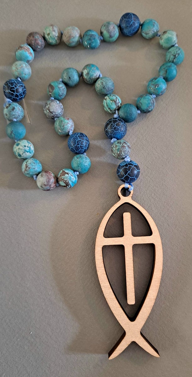 SIMON PIETARI Rukousnauha on käsin solmittu helmi helmeltä 8mm turkooseista imperial jaspis kivihelmistä ja 10mm sinisistä säröakaatti kivihelmistä. Rukoushelmien päässä on 7cm vaneripuinen ikhtys kristityn kala riipus, josta rukouspolku alkaa. Kivihelmet ja risti muistuttavat apostoli Pietarista, joka seurasi Kristusta. Rukousnauha sopii rukoukseen silloin, kun ihminen haluaa rukoilla rohkeutta, uskon vahvistumista ja luottamusta Jumalan kutsuun.
