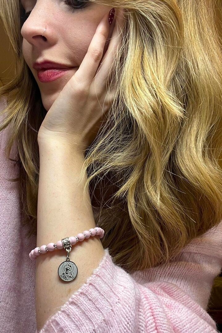 Tämä rannekoru rukousnauha kertoo uskosta ja rukouksesta, johon saa palata yhä uudelleen. Roikkuva Äiti Maria ja Jeesus-lapsi -ikoni on koskettava merkki lempeydestä, suojasta ja lohdutuksesta. Koru kutsuu pysähtymään rukoukseen ja muistuttaa, että Jumalan armo on lähellä myös tavallisessa arjessa.