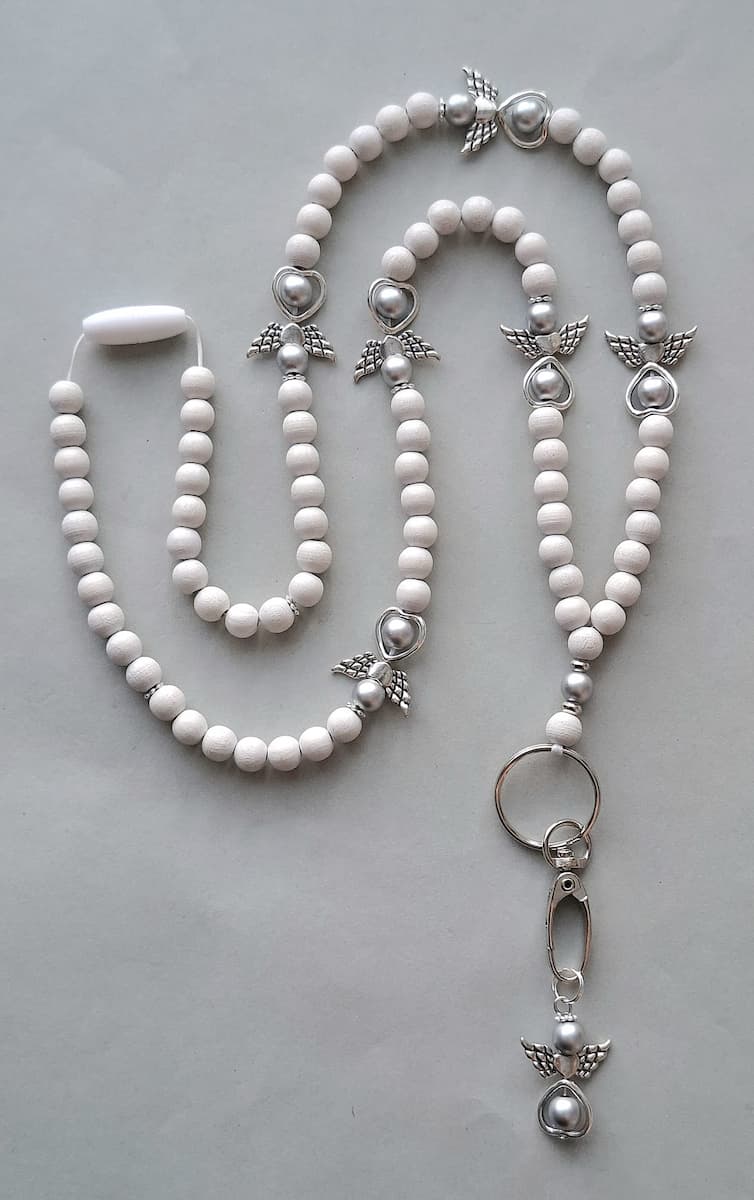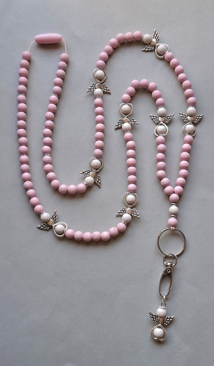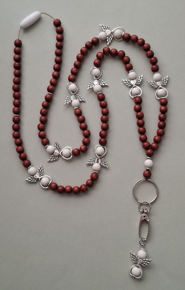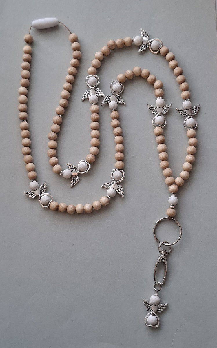 Jokainen enkeli-avainnauha kootaan käsityönä ekologisista ja myrkyttömistä puuhelmistä (hopeat helmet on akryylia). Enkeli-avainnauhoissa helmien koko on 8mm, mikä tekee nauhasta kevyen ja miellyttävän käyttää. Valitset sävyn ja pituuden, me viimeistelemme nauhan kestävään ja kauniiseen muotoon.