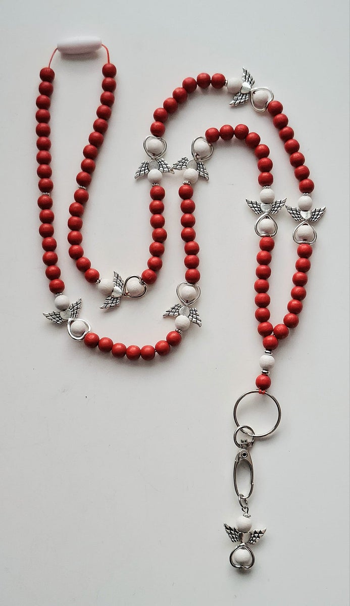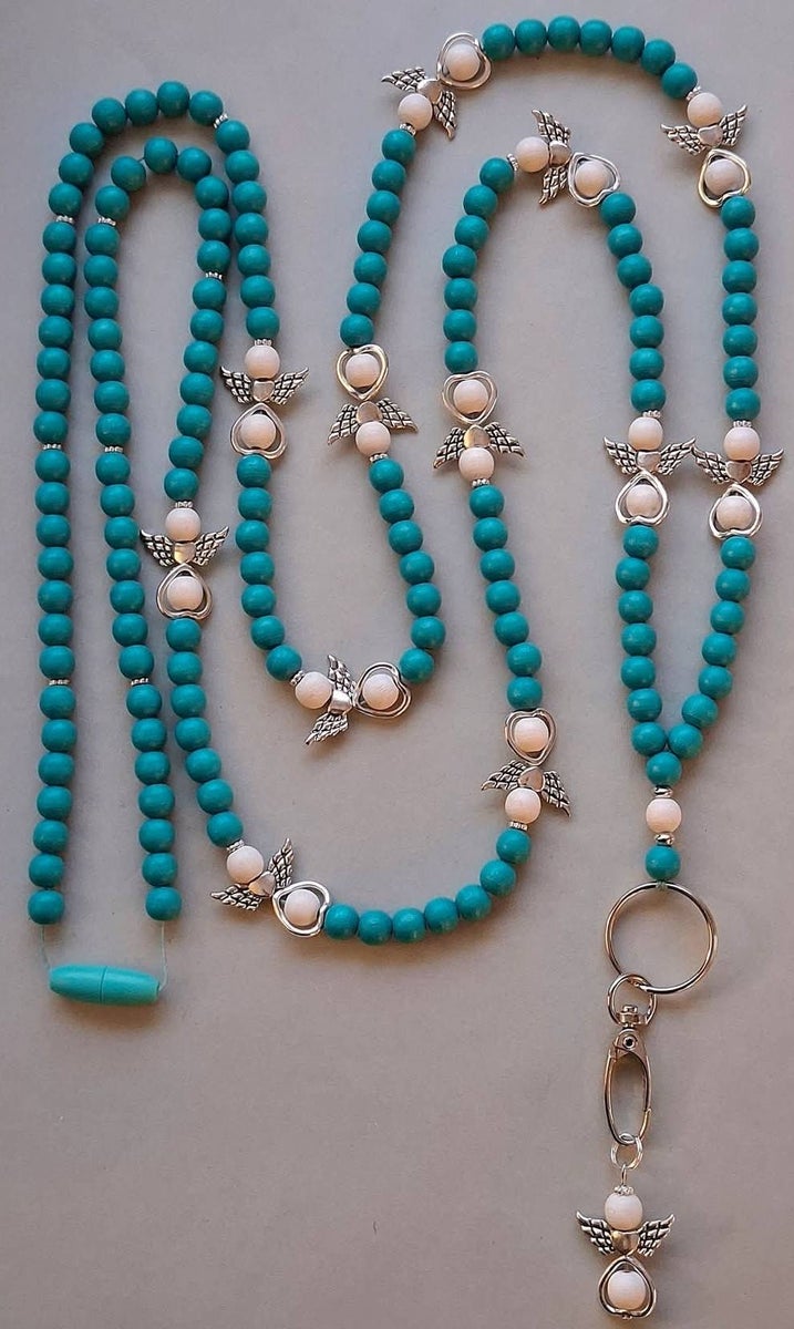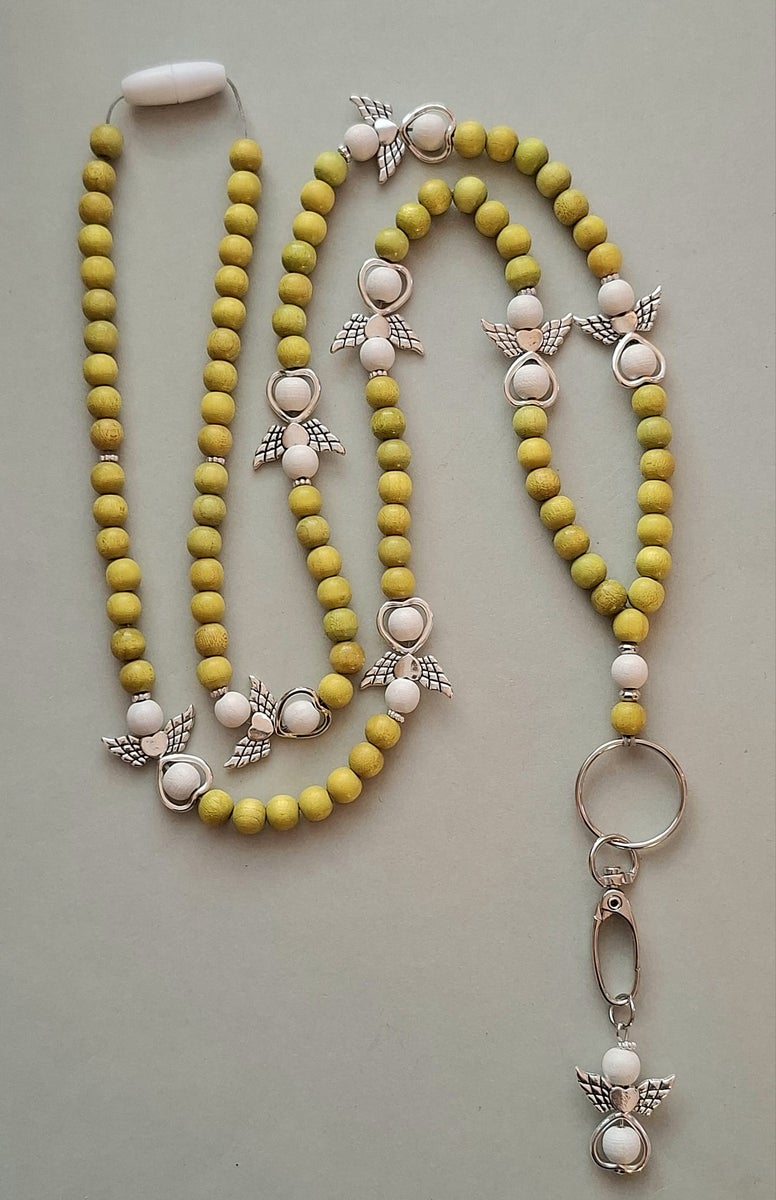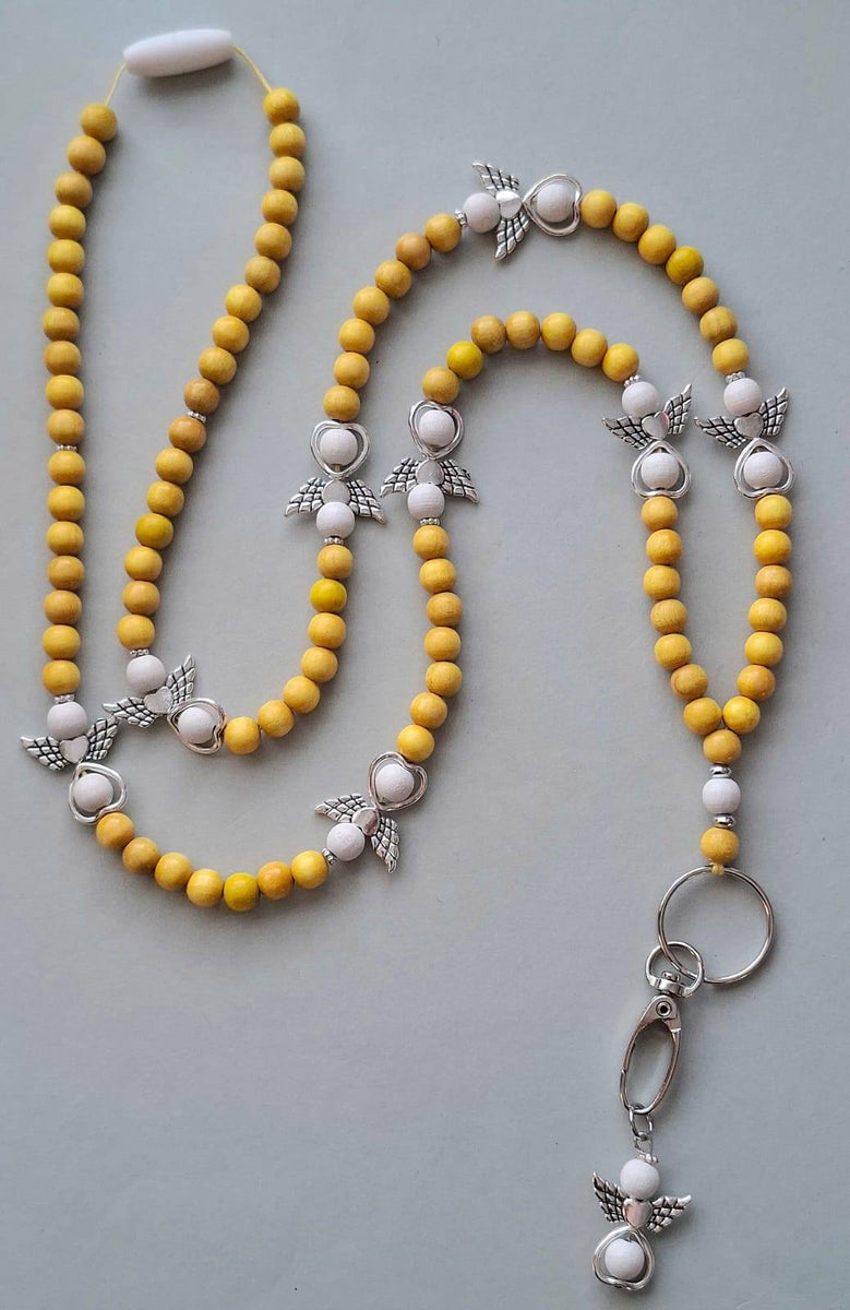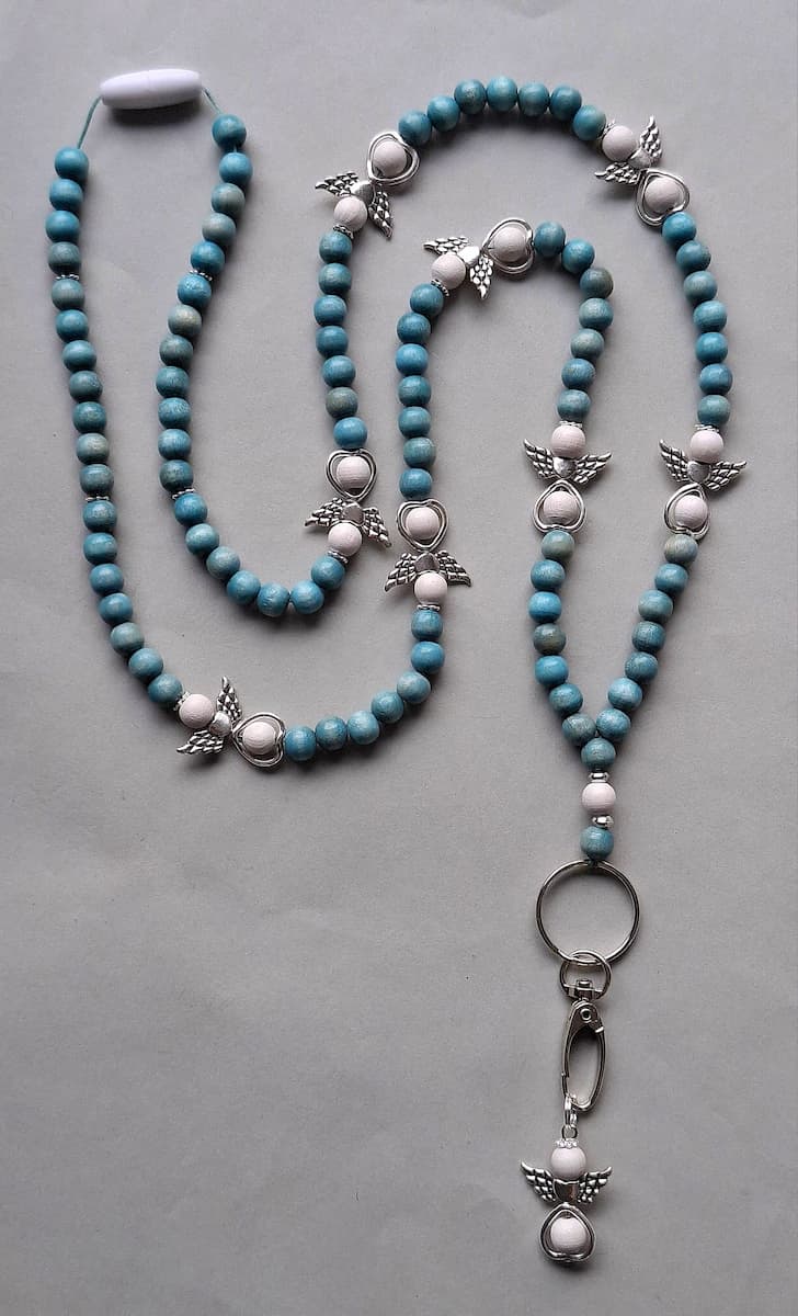Jokainen enkeli-avainnauha kootaan käsityönä ekologisista ja myrkyttömistä puuhelmistä (hopeat helmet on akryylia). Enkeli-avainnauhoissa helmien koko on 8mm, mikä tekee nauhasta kevyen ja miellyttävän käyttää. Valitset sävyn ja pituuden, me viimeistelemme nauhan kestävään ja kauniiseen muotoon.