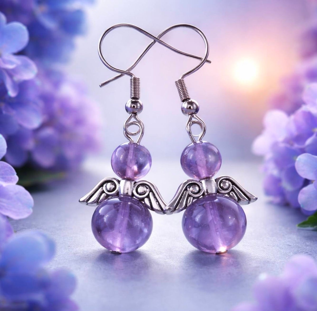 Ametisti enkelikorvakorut ovat herkkä ja rauhallinen korupari, jossa yhdistyvät enkelin symboli ja ametistin syvä violetti sävy. Korut on valmistettu 8mm ja 6mm ametistihelmistä, jotka muodostavat tasapainoisen ja kauniin kokonaisuuden. Ne kulkevat mukana arjessa hiljaisena muistutuksena lohdutuksesta ja lempeydestä.
