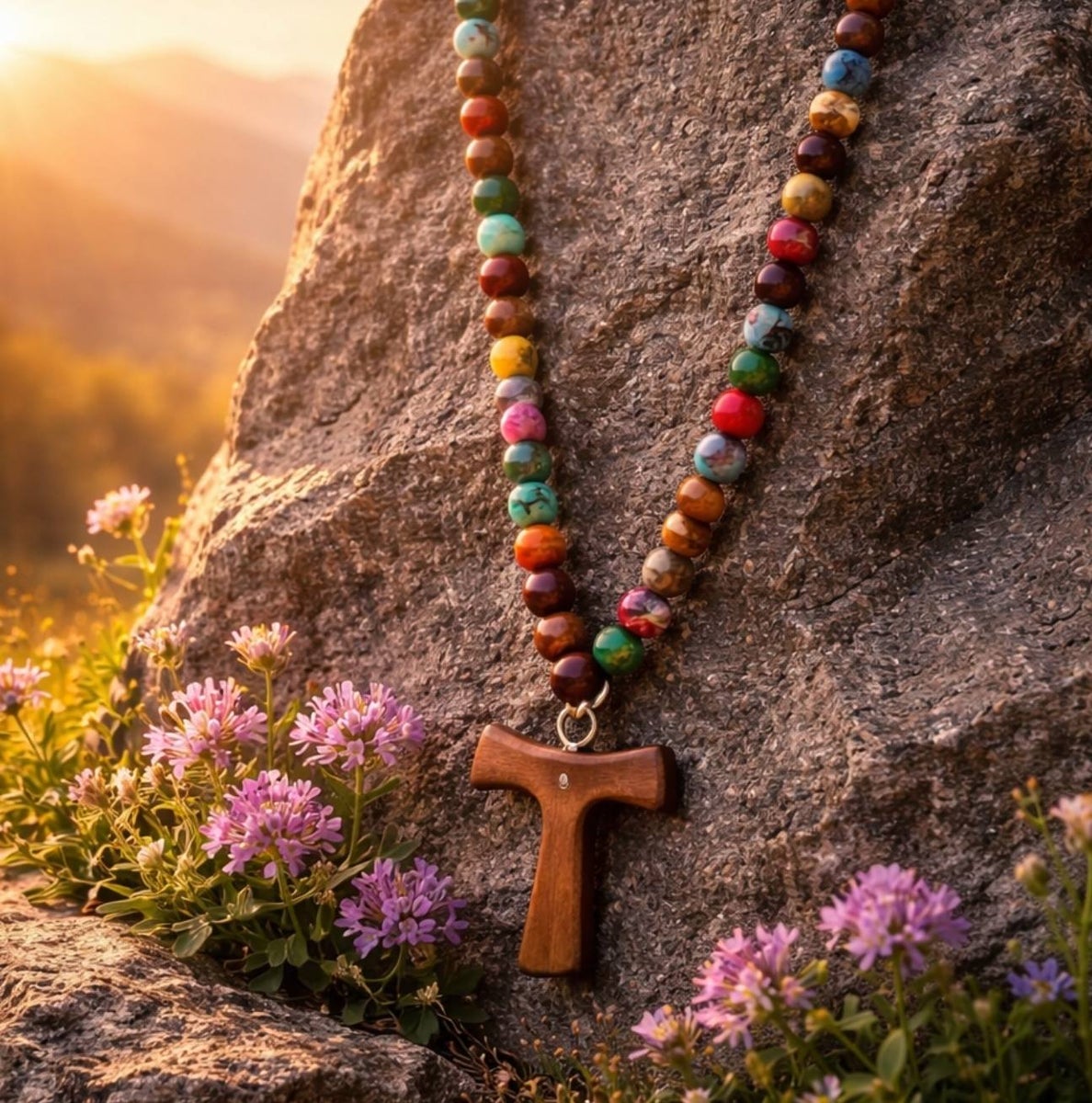 Pitkä helmikaulakoru toimii rukouksen muistuttajana ja hiljentymisen tukena arjen keskellä. Jokainen koru valmistetaan käsityönä valitsemistasi puu-, lasi- tai kivihelmistä ja noin 80cm pituus tekee siitä käytännöllisen käyttää ilman lukkoa. Koruun voidaan liittää riipus, joka antaa sille henkilökohtaisen merkityksen.
