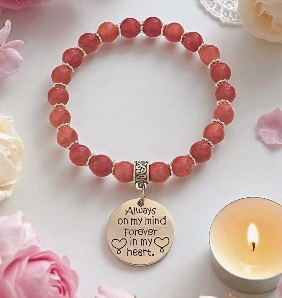 Muistorannekoru rakkaalle on herkkä ja merkityksellinen koru, joka kantaa mukanaan sanoman, jota joskus on vaikea pukea sanoiksi. Teksti “Close together or far apart – you are forever in my heart” tai vaihtoehtoisesti “Always on my mind – forever in my heart” muistuttaa, että rakkaus säilyy – olipa läheinen lähellä, kaukana tai jo taivaan kodissa.